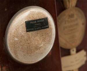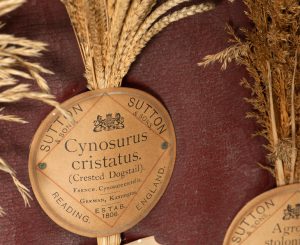 The bottom of the case proudly proclaims ‘Queen’s Seedsmen Reading’ – the Queen in question being Victoria, and the Seedsmen being Suttons Seeds company. Famous for inventing the paper seed packet, Suttons led the world in the cultivation, supply, marketing and distribution of bulbs and seeds in the nineteenth and twentieth centuries. This case advertises the different varieties of grasses the company produced, and was bought at a farm sale in Oxfordshire by the donor in 1950.