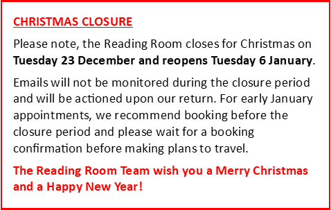 The Reading Room is open from Tuesday to Friday, 9.30am-4.30pm. We remain open over lunchtime, but we cannot retrieve extra material from the stores between 1pm to 2pm. We close promptly at the end of each day, so please allow time to pack up.