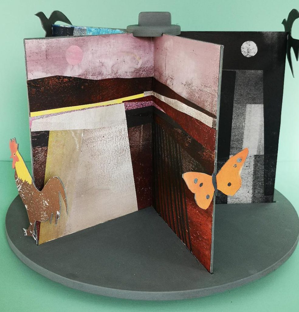 ‘We sought inspiration directly from the works creating our own landscapes and imaginings. We hand printed all our papers to use as collage taking direct inspiration from the colours found within the paintings and began to weave our stories building a 360 degree theatre that would spin through all seasons and building a cast of characters.’