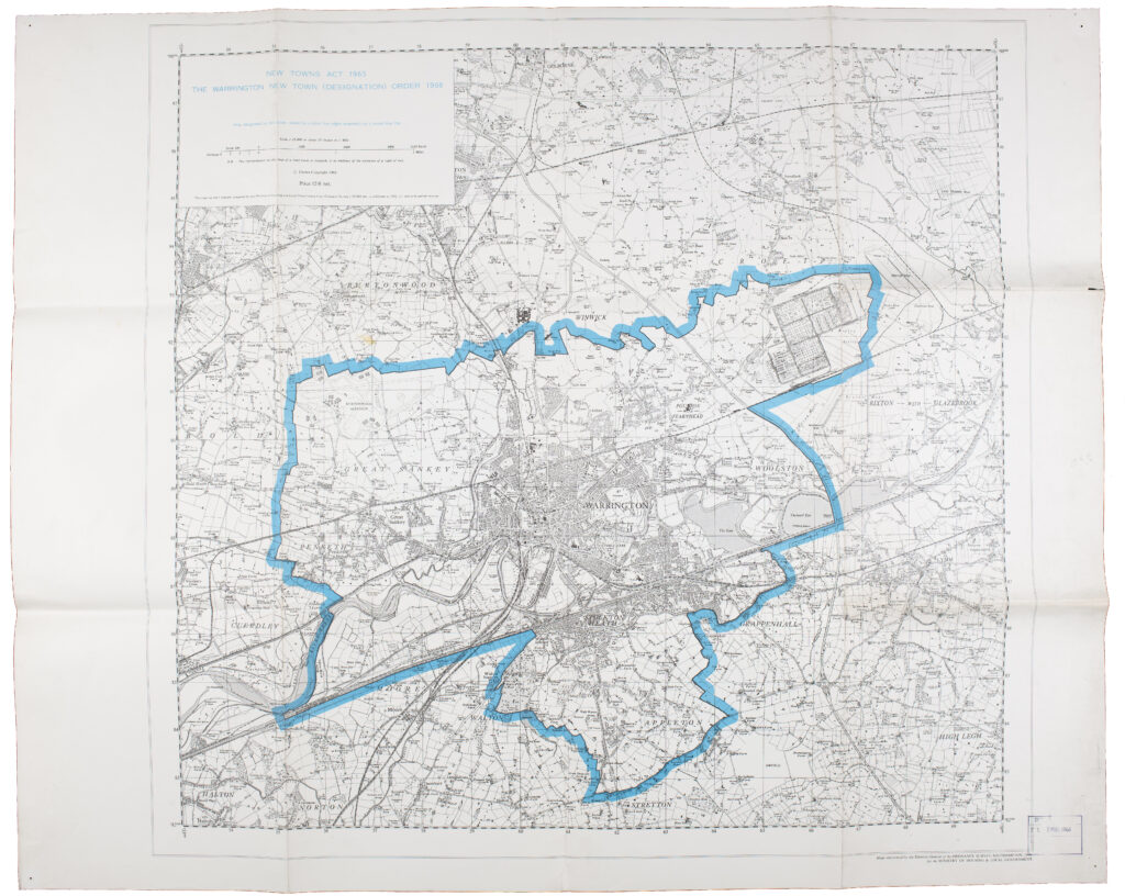 This Map prepared by the Ministry of Housing and local government depicts the new town of Warrington; Warrington was elected a new town in the third wave (1968).