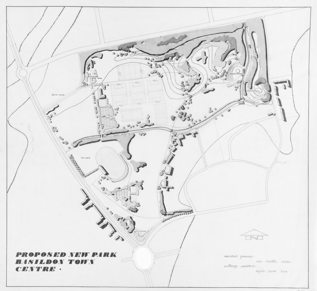 This drawing from our Sylvia Crowe collection shows a proposed new park for Basildon town centre, listing Architect Planner Noel Tweddle and Crowe as the Landscape Architect.